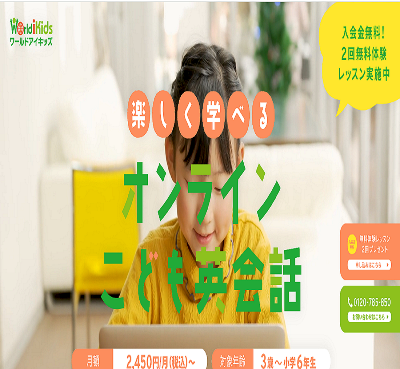 ワールドアイキッズは、幼児から小学生を中心にした子ども向けオンライン英会話サービスです。