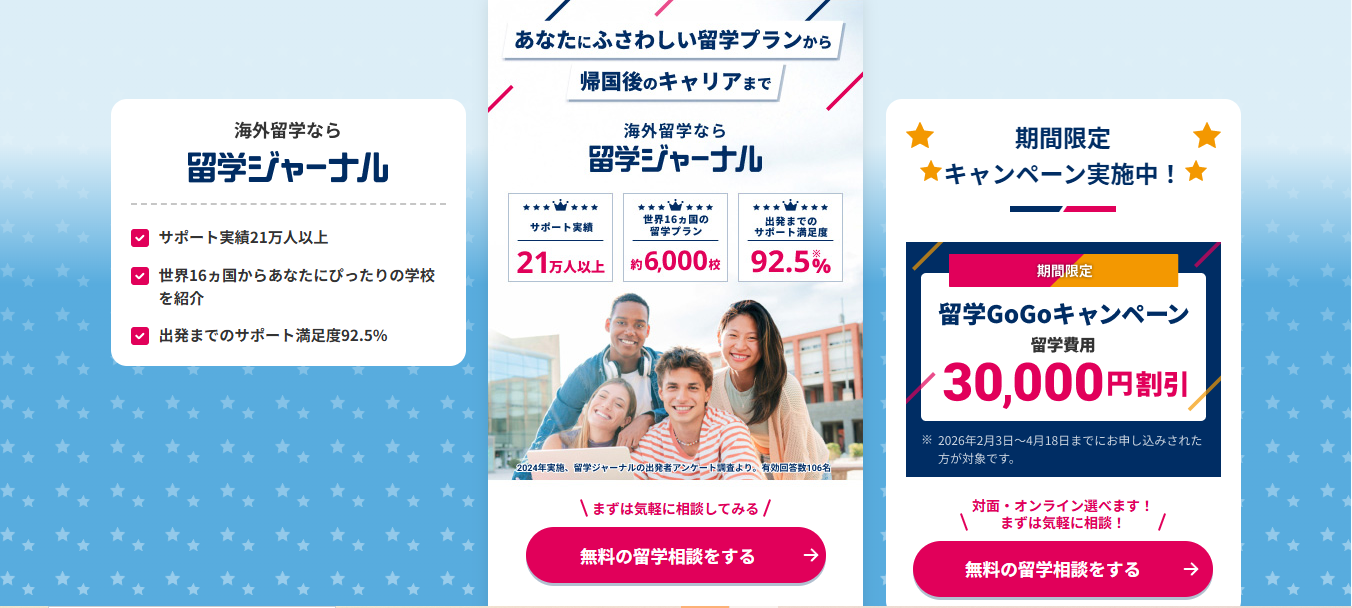 本気で留学を成功させたい方は、まずは【留学ジャーナル】の無料カウンセリングから始めてみてはいかがでしょうか。
