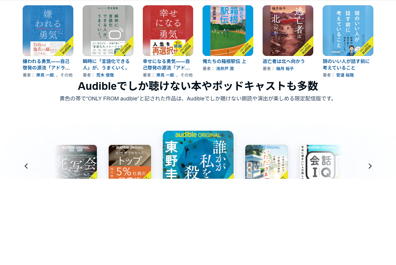 AmazonのオーディオブックAudibleは、プロのナレーターや声優が朗読した本を「耳で楽しめる」サービスです。