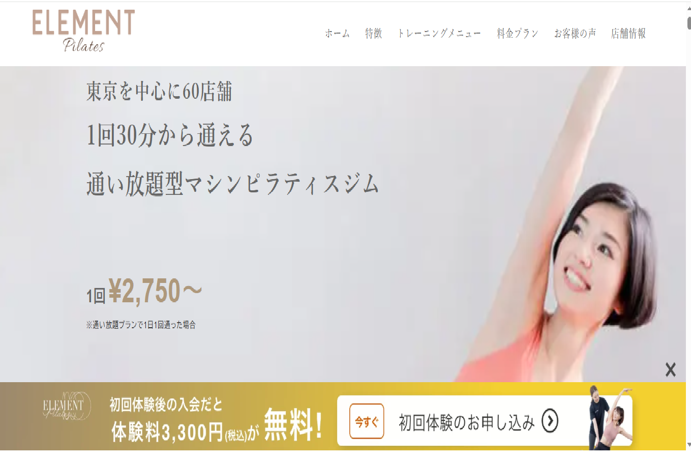 ELEMENTは、東京・神奈川を中心に全国へ展開している、日本最大級の「月額制・通い放題」パーソナルジムです。1回30分のトレーニングを軸に、プロのトレーナーによるマンツーマン指導を、定額で毎日でも受けることができます。