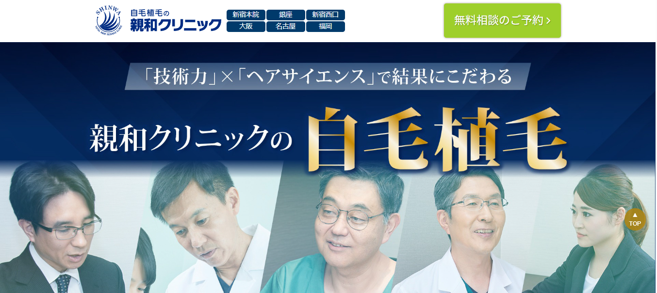 親和クリニックは、東京・名古屋・大阪・福岡に展開する自毛植毛特化型のクリニックです。年間1,200件以上の症例数を誇り、熟練の医師団によるチーム医療が最大の特徴です。
