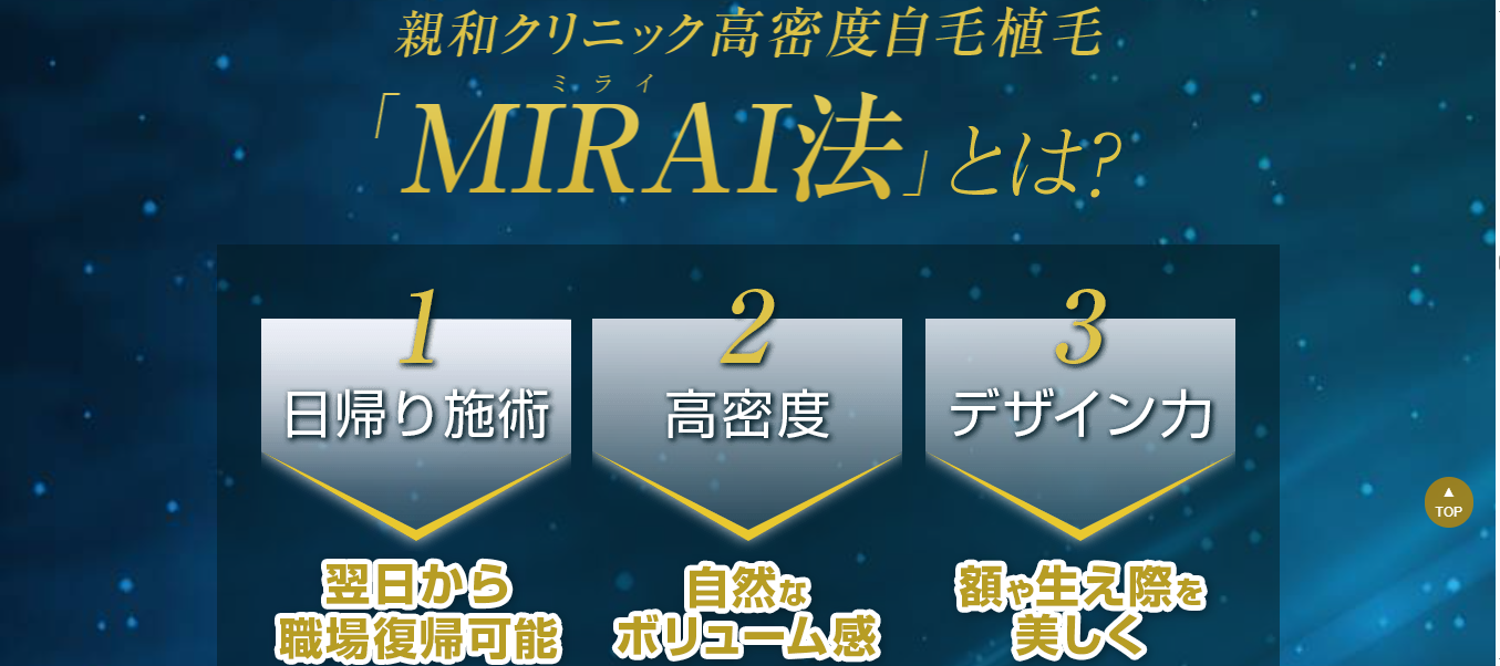 従来の植毛手術では頭皮を細長く切り取る方法が一般的でしたが、親和クリニックではメスを使用しない独自の「MIRAI法」を採用しています。
